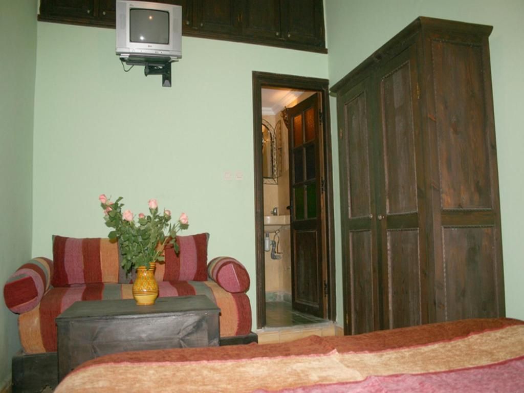 Cette chambre colorée dispose d’une terrasse, d’une salle de bains privative et d’un mobilier en bois sombre. Le logement comprend un très grand lit.